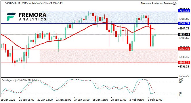 US equities pulled back as aggressive selling in technology stocks triggered a rotation rather than a full risk-off move. The S&P 500 surrendered the 7,000 level, while capital rotated into industrials, financials, and consumer defensives.