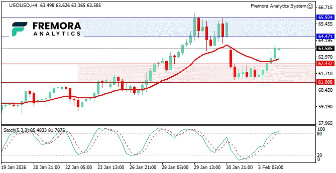 WTI crude is consolidating near 63.60 after violent repricing earlier in the week. The restart of Iran-US nuclear talks forced traders to unwind escalation-driven longs rapidly, compressing prices back into a neutral range.