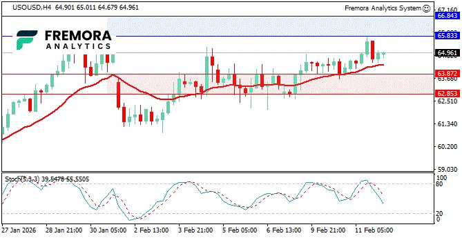 Oil remains supported while above 63.87. A break above 65.83 targets 66.84, but failure to hold support quickly exposes 62.85.