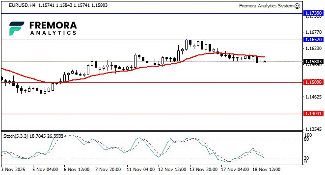 EUR/USD slipped to multi-day lows near 1.1570 as the Dollar held steady in a risk-off environment. The pair continues to fade from the 1.1600+ zone as markets digest the latest shift in rate expectations—December Fed cut odds have plunged from over 90% to roughly 45%, reinforcing support for the Greenback.