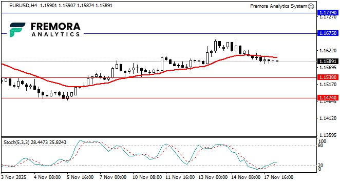 EUR/USD softened for a second straight session, slipping toward the 1.1590–1.1580 zone as the US Dollar regained upside momentum. The Dollar Index climbed toward 99.50, supported by the market’s aggressive repricing of December Fed cuts.