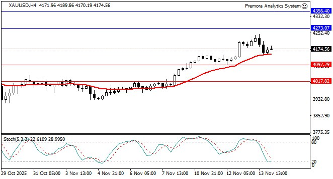 Fremora Takeaway Gold’s consolidation near $4,175 demonstrates impressive resilience given the brutal equity market selloff and sharp recalibration in Fed rate cut expectations. The technical picture suggests potential stabilization after Thursday’s retreat from three-week highs, with the Stochastic attempting to cross higher from oversold territory. The unprecedented uncertainty about missing October economic data creates a supportive environment for portfolio hedging, helping offset the headwind from reduced near-term rate cut odds. Today’s Fed speakers (Logan and Bostic) could provide the next directional catalyst—any acknowledgment of the data challenges would support gold, while hawkish pushback might pressure prices toward $4,100. The uptrend remains intact while price holds above $4,097 and the 20-period moving average.