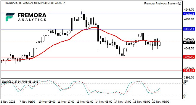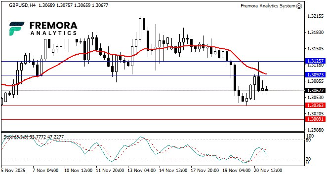 Sterling’s support comes from intraday flows and short-covering—not fundamentals. UK data remains soft: inflation slowed, wage growth decelerated, and GDP stagnated. Markets now price roughly 40–45% probability of a December BoE cut.