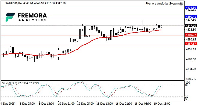 Gold consolidates near 4,347 as buyers defend the post-CPI breakout zone. The broader macro backdrop remains supportive, though holiday trading limits momentum expansion.