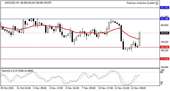 Fremora Takeaway WTI crude oil’s modest recovery to near $60 suggests stabilization after Wednesday’s sharp decline, though the technical structure remains bearish with price below the 20-period moving average. The consolidation around current levels reflects the market’s indecision—caught between geopolitical support from potential Russian sanctions and fundamental concerns about global oversupply. Immediate resistance at 61.19 represents the first significant hurdle, with the more important 62.25 barrier beyond. The oversold bounce appears to be losing momentum, and crude remains vulnerable to renewed selling pressure if global growth concerns intensify. The complex data landscape following the shutdown resolution adds uncertainty, with potential for increased volatility as markets assess what delayed reports reveal about petroleum demand during the extended government closure.