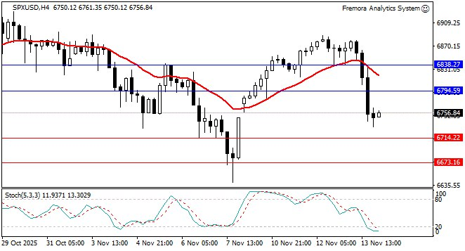 Fremora Takeaway The S&P 500’s brutal 1.66% decline represents a significant shift in market sentiment following the recent rally to near-record levels. The technical picture has deteriorated markedly, with price below the 20-period moving average and momentum indicators in oversold territory. While this condition typically suggests a short-term bounce could emerge, the fundamental backdrop has weakened with the sharp drop in December rate cut odds. The index faces a critical test at 6714.22 support—holding this level might allow for stabilization, while a break below could accelerate declines toward 6673. Today’s Fed speakers (Logan and Bostic) could provide the next directional catalyst—any acknowledgment of the unprecedented data challenges would support a technical bounce toward 6794 resistance, while hawkish rhetoric would likely extend the decline.