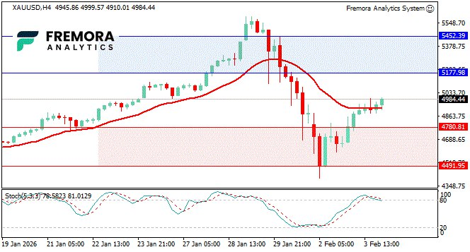 Gold continues its recovery, trading near 4,984 after rebounding sharply from last week’s historic selloff. The bounce signals strong dip-buying interest following extreme liquidation, particularly after silver’s violent collapse raised fears of broader contagion.