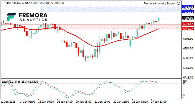US equities continue to grind higher, with the S&P 500 breaking above 7,000 as investors focus on AI-linked earnings momentum rather than currency stress. Big Tech anticipation remains the engine, supported by expectations around capex and monetization signals. The Fed decision adds a major macro catalyst, but equity pricing suggests investors are still prioritizing growth narratives and earnings confirmation over broader “Sell America” anxieties in FX.
