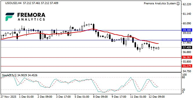 Oil remains structurally weak below $58. Until price reclaims the 20-period MA, rallies are corrective rather than trend-shifting. A break below 56.27 would expose deeper downside toward the October lows.