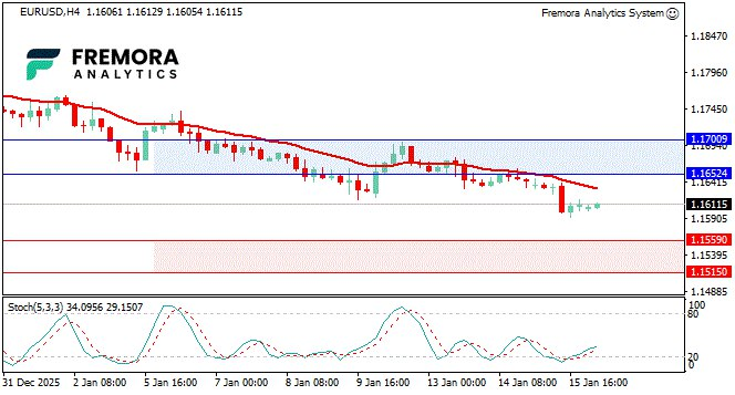 EUR/USD slipped again as the US Dollar caught a bid on stronger labor data. The market read low jobless claims as “no rush” for Fed cuts, while a brief easing in the Powell political risk narrative reduced immediate uncertainty around Fed leadership.